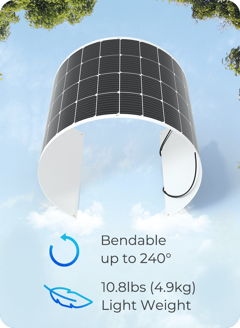 The 200W flexible solar panel can bend up to 240° and is 50% lighter than traditional rigid panels, making it highly portable and easy to install. Additionally, an embedded composite material layer enhances both durability and flexibility.